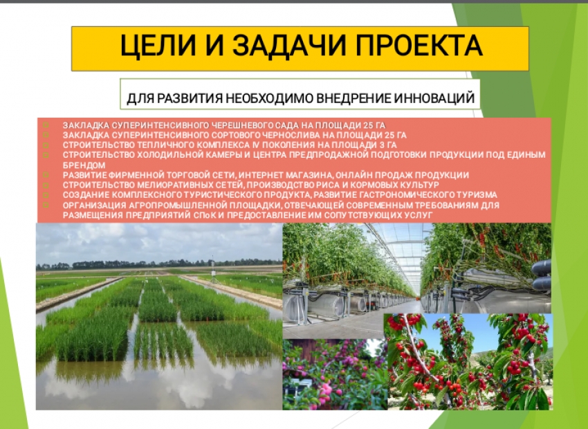 По его словам, проектом предусмотрено развитие фирменной торговой сети, интернет магазина, онлайн продажа продукции, строительство мелиоративных сетей, производство риса и кормовых культур, создание комплексного туристического продукта, развитие гастрономического туризма, организация агропромышленной площадки, отвечающей современным требованиям для размещения предприятий СПоК и представление им сопутствующих услуг.