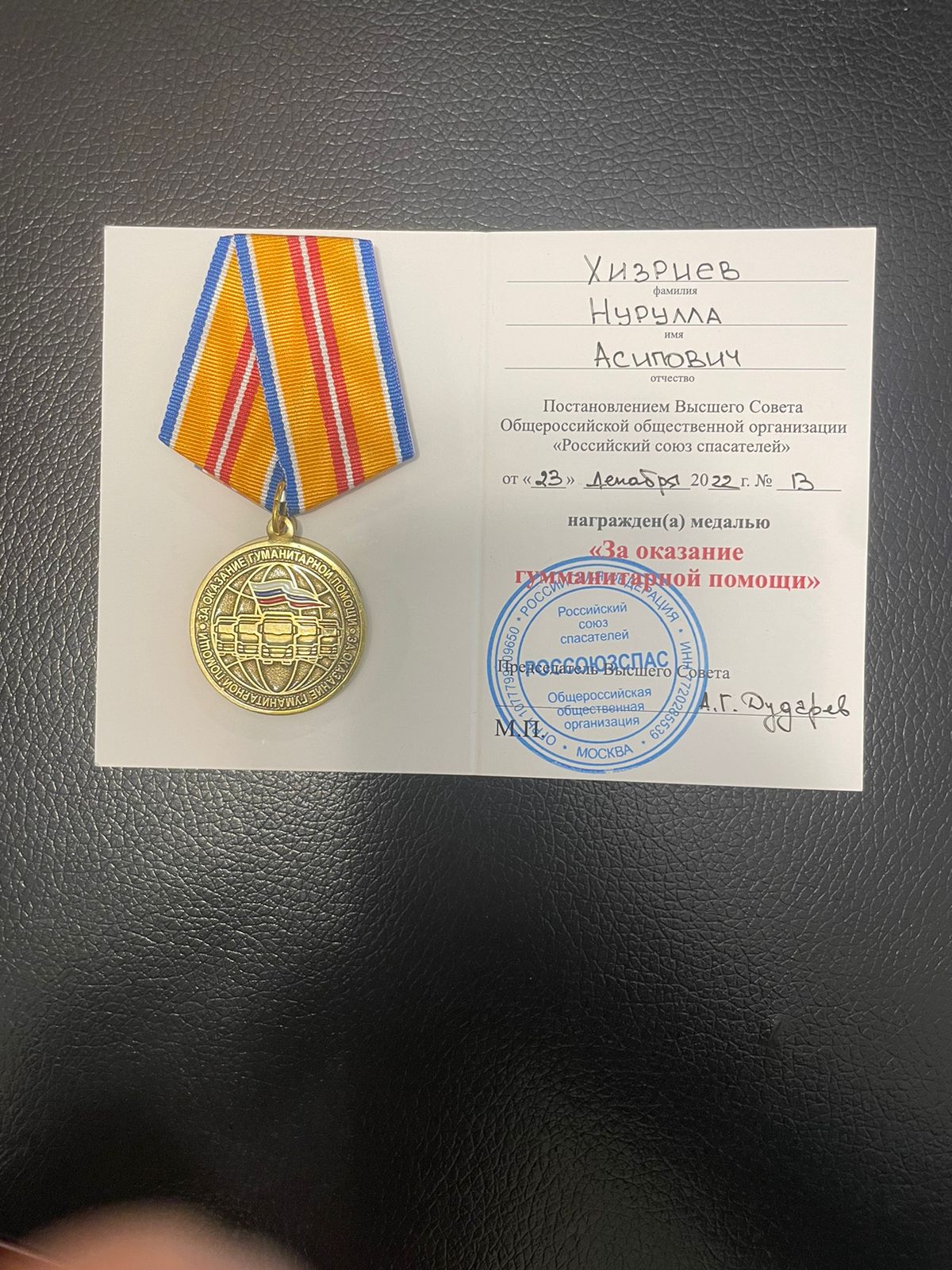 Для справки : медаль «За оказание гуманитарной помощи» - это награда Общероссийской общественной организации «Российский союз спасателей».