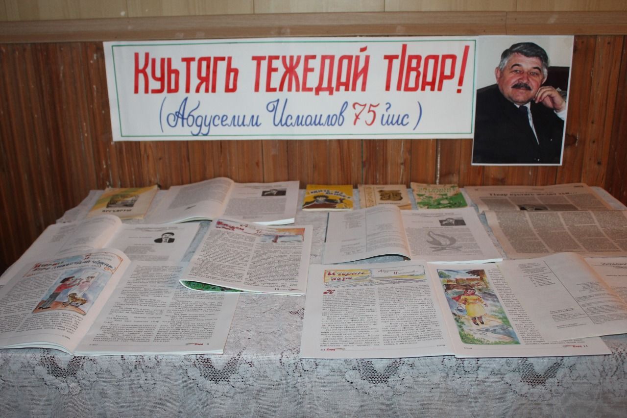 В стенах библиотеки развернули и книжную выставку «Куьтягь тежедай тIвар», посвященную 75-юбилею Народного писателя и Заслуженного деятеля искусств РД Абдуселима Исмаилова.
