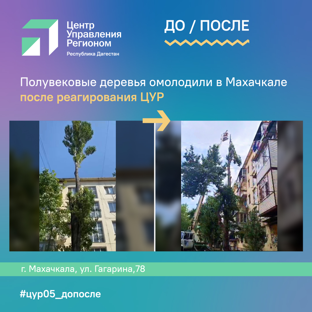 Сотрудники ЦУР передали обращение через ЦУГ Махачкалы в МБУ «Благоустройство». На следующий день деревья омолодили и обрезали до необходимого уровня, сообщили информагентству.