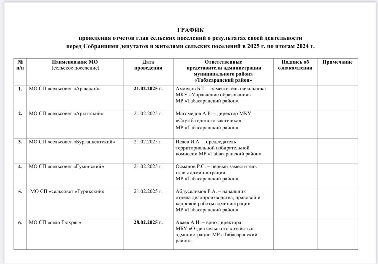 Согласно установленному графику в сельских поселениях Табасаранского района будут проходить отчеты глав сельских поселений о результатах своей деятельности, деятельности администраций сельских поселений и иных подведомственных органов местного самоуправления по итогам 2024 года перед депутатами сельских поселений с участием представителей администрации района и общественности сел.