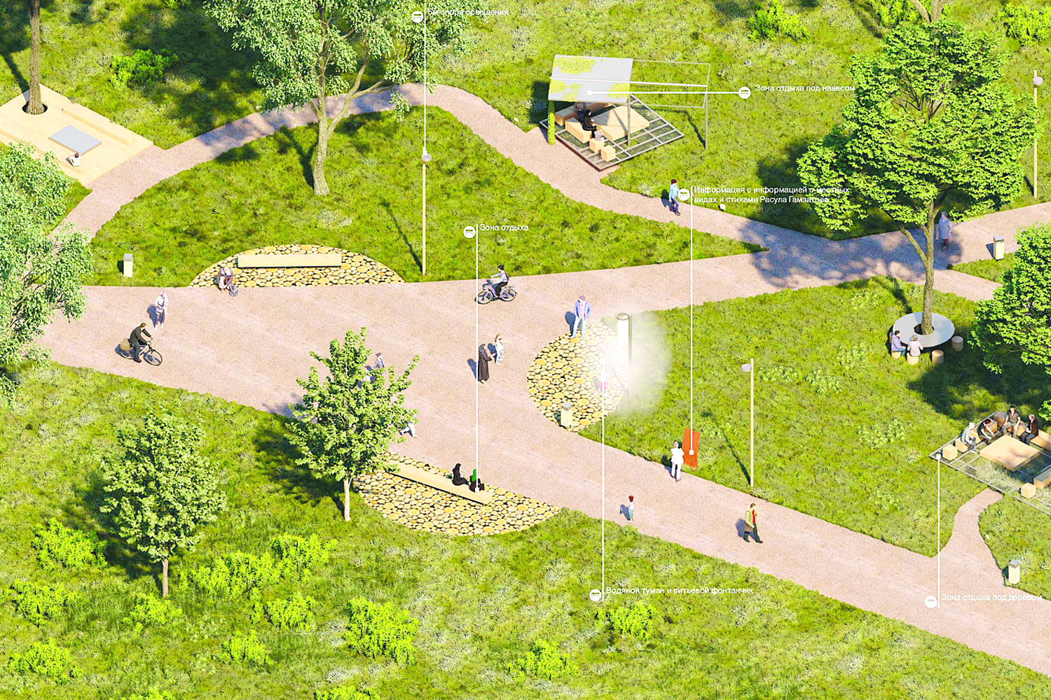 Что касается материала, который будет использован, то предусмотрено 5 видов покрытий – это деревянный настил – лесная аллея и секретные тропы; каменные плиты–зона мангалов; гранитный отсев–основные и второстепенные тропы; деревянное мощение – зоны отдыха, зоны массовых мероприятий, экопавильон; древесная кора – детские площадки. Тропиночная сеть основана на базе сложившихся транзитных путей с минимизацией нагрузки в лесной зоне с помощью использования террасного покрытия на сваях. Только естественные материалы будут использованы в покрытиях.