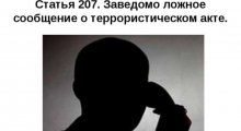 В настоящее время достаточно часто в СМИ появляется информация о ложных сообщениях, о готовящихся терактах. Законодательством Российской Федерации уголовная ответственность за указанные правонарушения предусмотрена. В частности, статья 207 УК РФ определяет, что заведомо ложное сообщение о готовящемся взрыве, поджоге или иных действиях, создающих опасность гибели людей, причинения значительного имущественного ущерба либо наступления иных общественно опасных последствий, наказывается штрафом в размере до 200 тыс. рублей или в размере заработной платы или иного дохода осужденного за период до 18 месяцев либо исправительными работами на срок от 1 года до 2 лет, либо арестом на срок от 3 до 6 месяцев, либо лишением свободы на срок до 3-х лет.