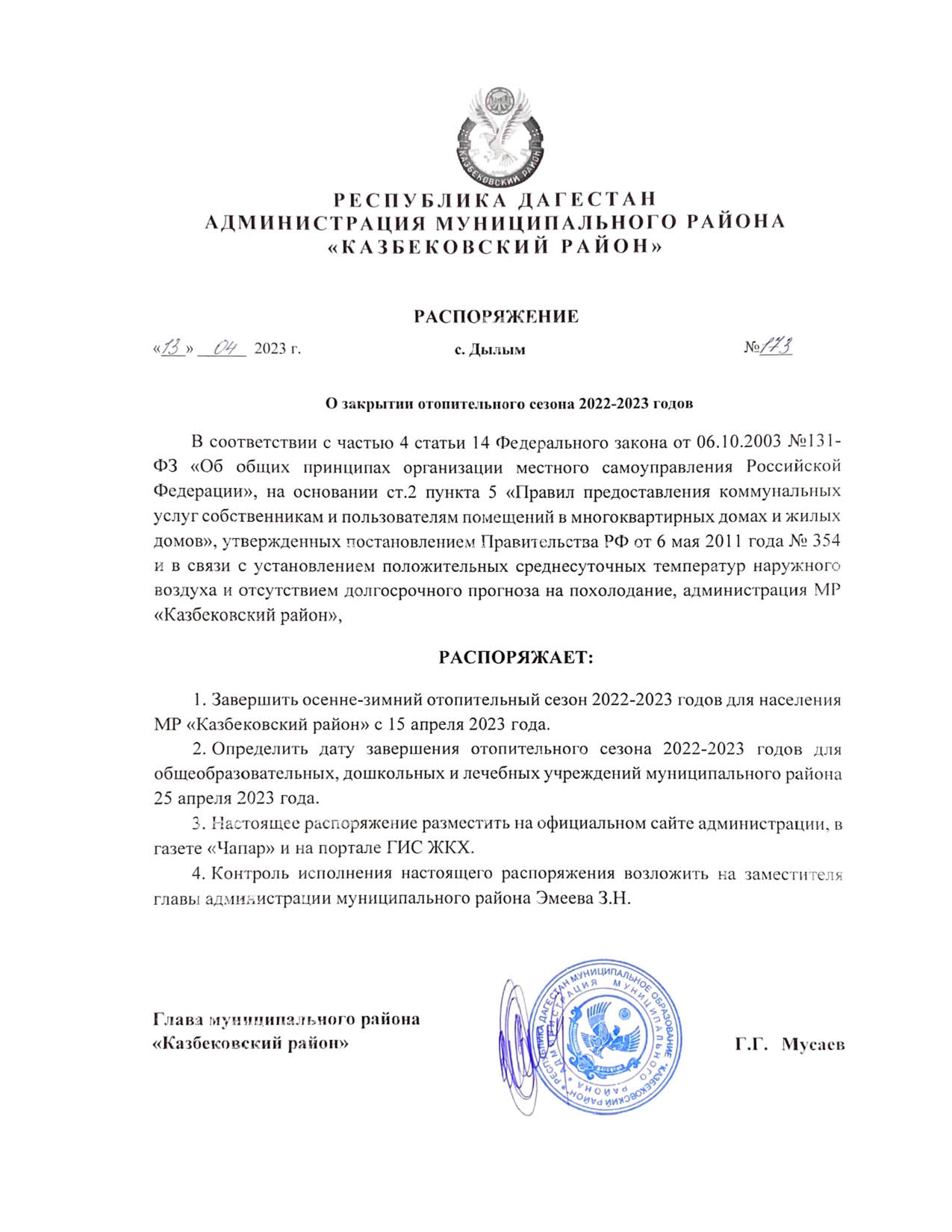 О закрытии отопительного сезона 2022-2023 годов, Расп.№173-13.04.2023