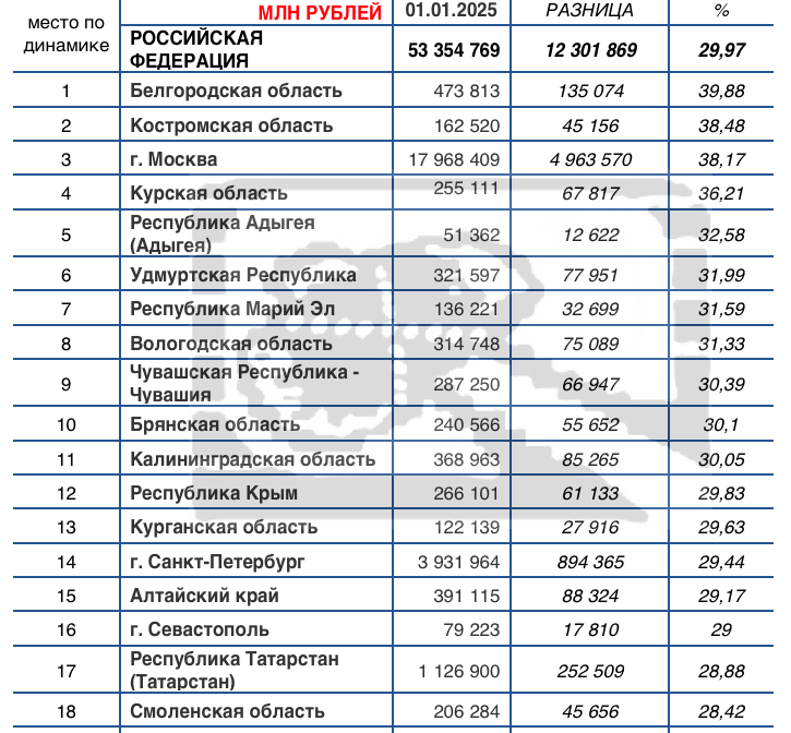 Если сравнить данные за год, то россияне увеличили вклады на 12,3 трлн рублей до 53,3 трлн рублей . Рост почти на 30%. Самая большая динамика роста у Белгородской области +39,88%, Костромской области 38,48% и г. Москвы +38,17%.