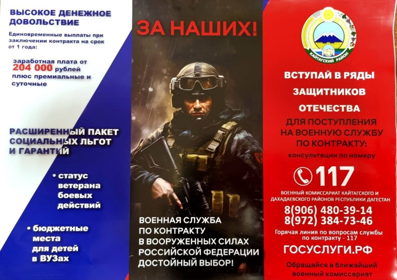 Военный комиссариат Кайтагского и Дахадаевского районов продолжает набор на службу по контракту.
