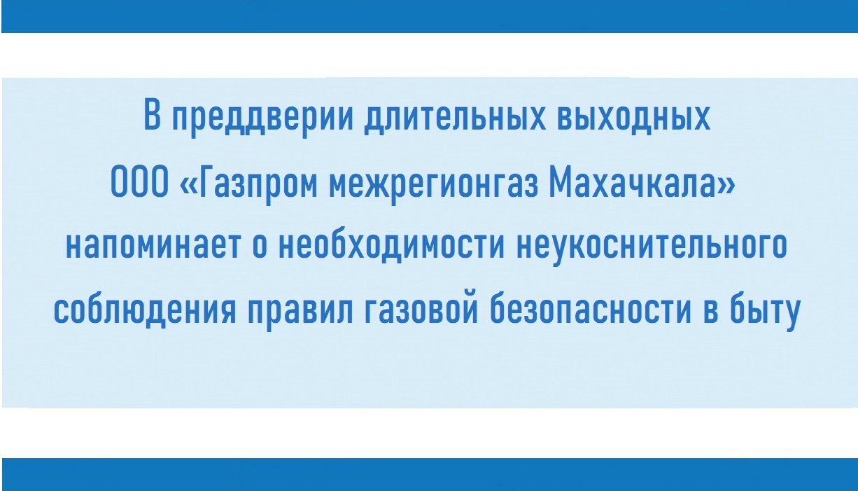 Жителям Республики Дагестан в преддверии длительных выходных ООО «Газпром межрегионгаз Махачкала» напоминает о необходимости неукоснительного соблюдения правил газовой безопасности в быту.