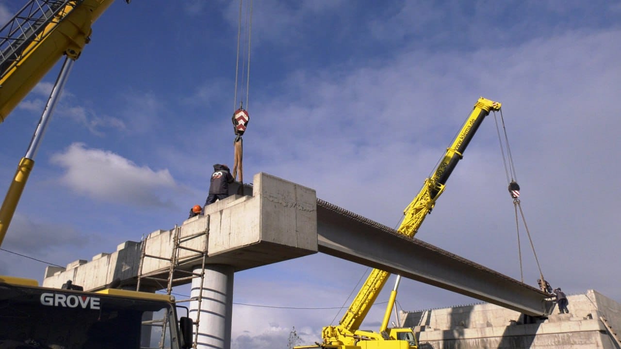 Путепровод состоит из 18 пролетов, в каждом из них по 7 балок. Вес каждой балки 34 тонны, длина 24 метра.