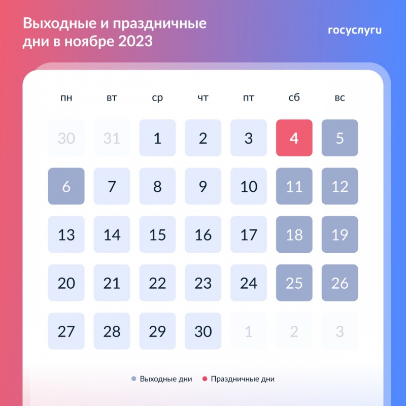 4 ноября — День народного единства. Это государственный праздник и всегда выходной день. В 2023 году он выпадает на субботу, поэтому предусмотрен перенос дня отдыха на понедельник.