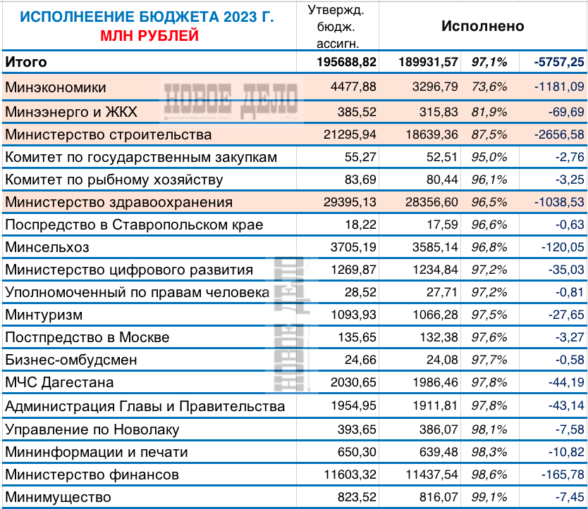 Минстрой Дагестана больше всего не освоил средств, на сумму более 2,6 млрд рублей. Однако Минстрой на 3-м место по доле неосвоенных бюджетных средств. Первый здесь Минэкономики , которое не освоило 26,4% выделенных средств.