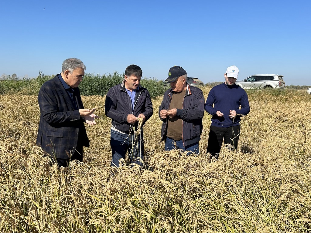 Затем делегация посетила ООО «Шанс», где уже убрано 180 га риса из 260 га посеянного. Последним пунктом поездки стали поля ООО КУМК, где посеяно 900 га риса сорта «Бальдо», из которых уже убрано 300 га. В хозяйстве также построены складские помещения для хранения около 20 000 тонн риса.