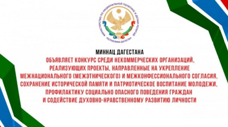Министерство по национальной политике и делам религий Республики Дагестан объявляет конкурс по привлечению некоммерческих организаций к реализации проектов, направленных на укрепление межнационального (межэтнического) и межконфессионального согласия, сохранение исторической памяти и патриотическое воспитание молодежи, профилактику социально опасного поведения граждан и содействие духовно-нравственному развитию личности.