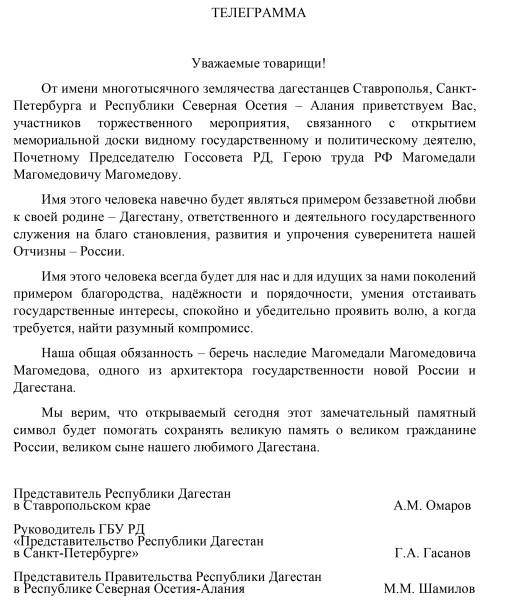 Представители Республики Дагестан направили телеграмму по случаю торжественного мероприятия, связанного с открытием мемориальной доски Магомедали Магомедову