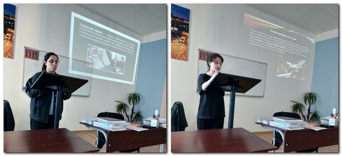 Студенты выступили с докладами — презентациями по исследуемым актуальным вопросам кружка «Письменный перевод»: «Основные виды перевода», «Проблемы перевода медицинских текстов», «Особенности перевода юридических текстов», «Технический перевод», «Особенности перевода экономических текстов», «Художественный перевод». Участники заседания проанализировали специфику письменного перевода различных типов текста, выявили потенциальные переводческие трудности и определили принципы использования переводческих трансформаций.