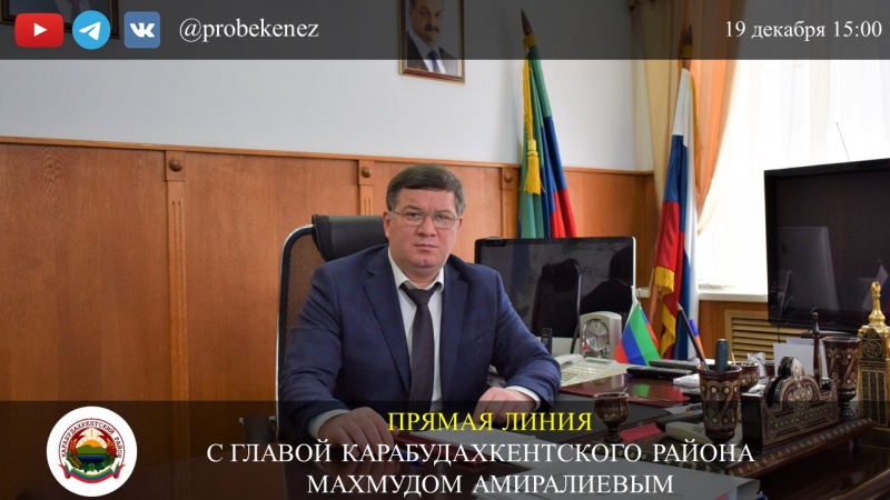 19 декабря 2023 года в 15:00 состоится «Прямая линия» с главой МР «Карабудахкентский район» Махмудом Гусейновичем Амиралиевым.