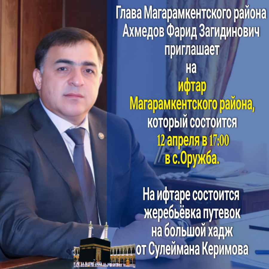 12 апреля в 17:00 ч. в с.Оружба состоится ИФТАР МАГАРАМКЕНТСКОГО РАЙОНА от главы Магарамкентского района Ахмедова Фарида Загидиновича.